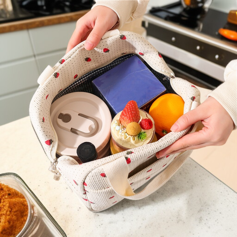 ● 輕巧便攜手提設計,容量充足,能輕鬆裝下飯盒、水果、飲料等,適合上班、上學或野餐使用。