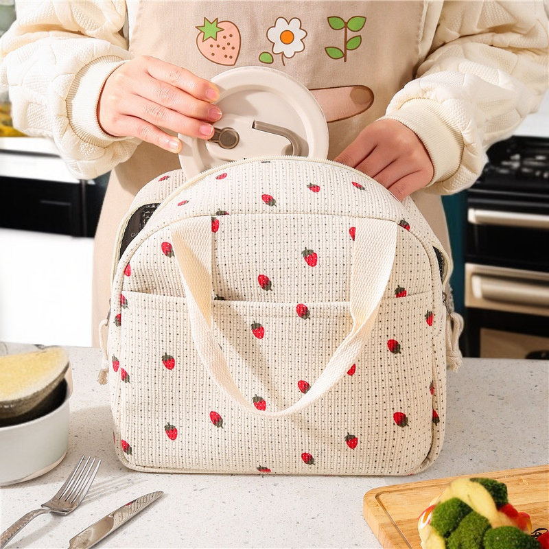便攜式保溫午餐包燈芯絨草莓手提飯盒袋