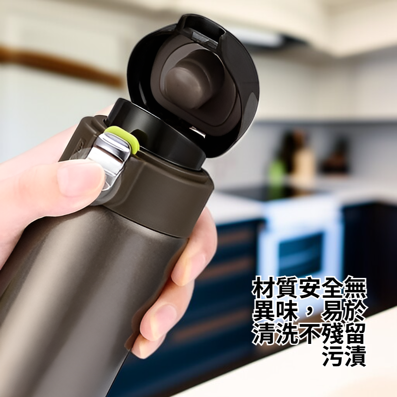 ● 彈跳式杯蓋設計,單手即可輕鬆開啟,搭配安全鎖扣,防止漏水,方便攜帶外出或上學使用。